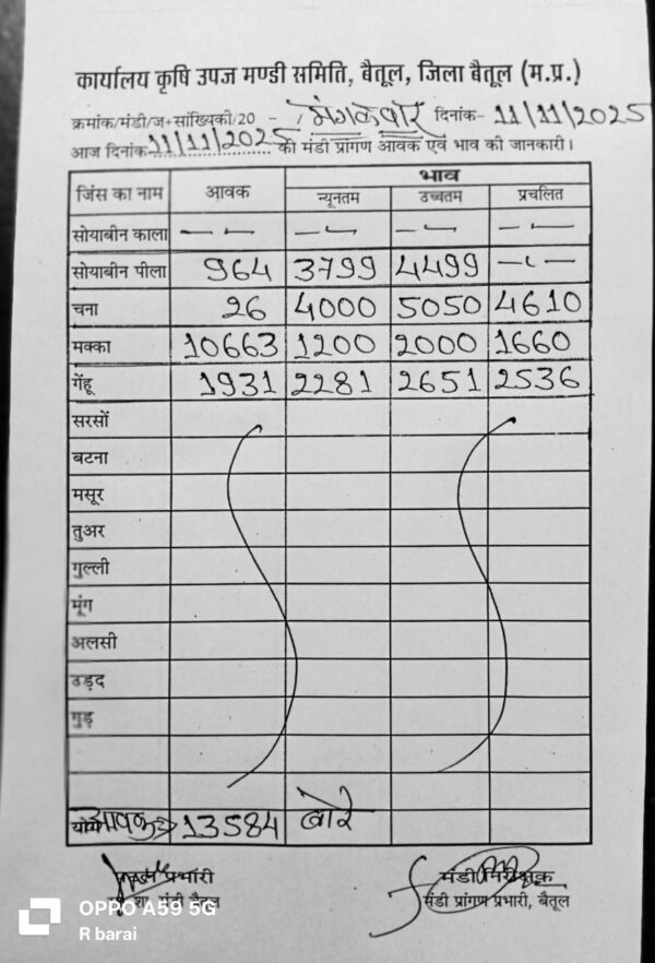Betul Mandi Bhav 11 November 2025 : आज 11 नवंबर 2025 के बैतूल मंडी भाव, 13 हजार बोरे रही उपज की आवक
