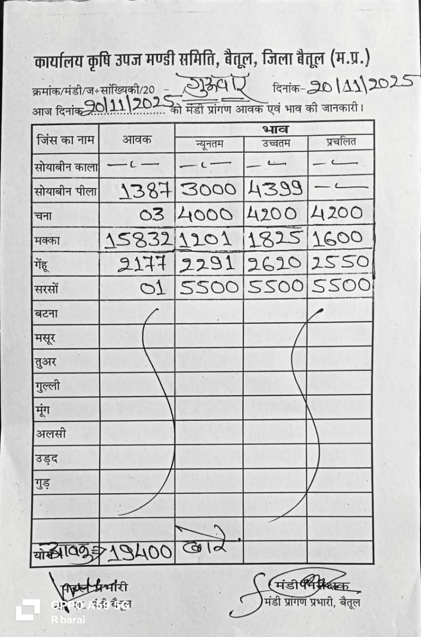 Betul Mandi Bhav 20 November 2025 : गुरुवार को बैतूल मंडी में खरीदी हुई। उपज के दामों में भी उतार चढ़ाव देखने को मिल रहा है। 20 नवम्बर 2025 को बैतूल मंडी में कुल उपज की आवक 19 हजार 400 बोरे रही। 2177 बोरे आवक गेंहू की आवक रही। सोयाबीन की 1387 बोरे मक्का की आवक 15832 बोरे रही है।l