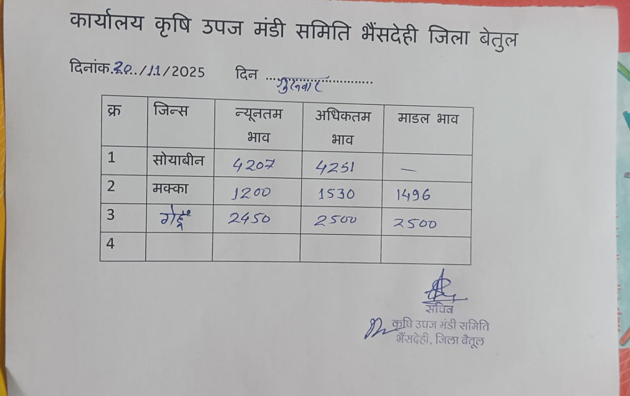 Betul Mandi Bhav 20 November 2025 : आज 20 नवंबर 2025 के बैतूल, भैंसदेही मंडी भाव, 19 हजार बोरे रही उपज की आवक