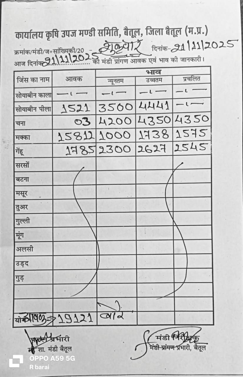Betul Mandi Bhav 21 November 2025 : शुक्रवार को बैतूल मंडी में खरीदी हुई। उपज के दामों में भी उतार चढ़ाव देखने को मिल रहा है। 21 नवम्बर 2025 को बैतूल मंडी में कुल उपज की आवक 19 हजार 121 बोरे रही। 1785 बोरे आवक गेंहू की आवक रही। सोयाबीन की 1521 बोरे मक्का की आवक 15812 बोरे रही है। l