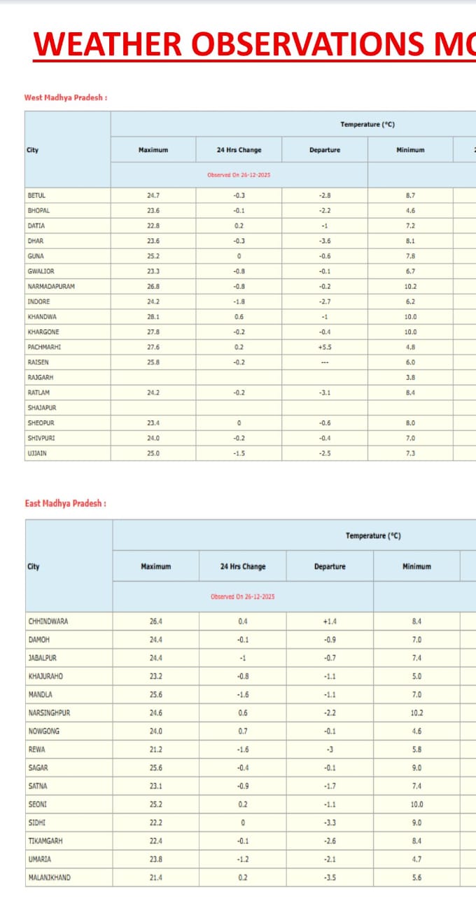 मौसम विभाग के अनुसार सिंगरौली, सीधी, रीवा, मऊगंज, सतना, पन्ना, छत्तरपुर ग्वालियर, दतिया, भिंड, उमरिया, टीकमगढ़, निवाली, मेहर में घना कोहरा छाया रहने की संभावना है।