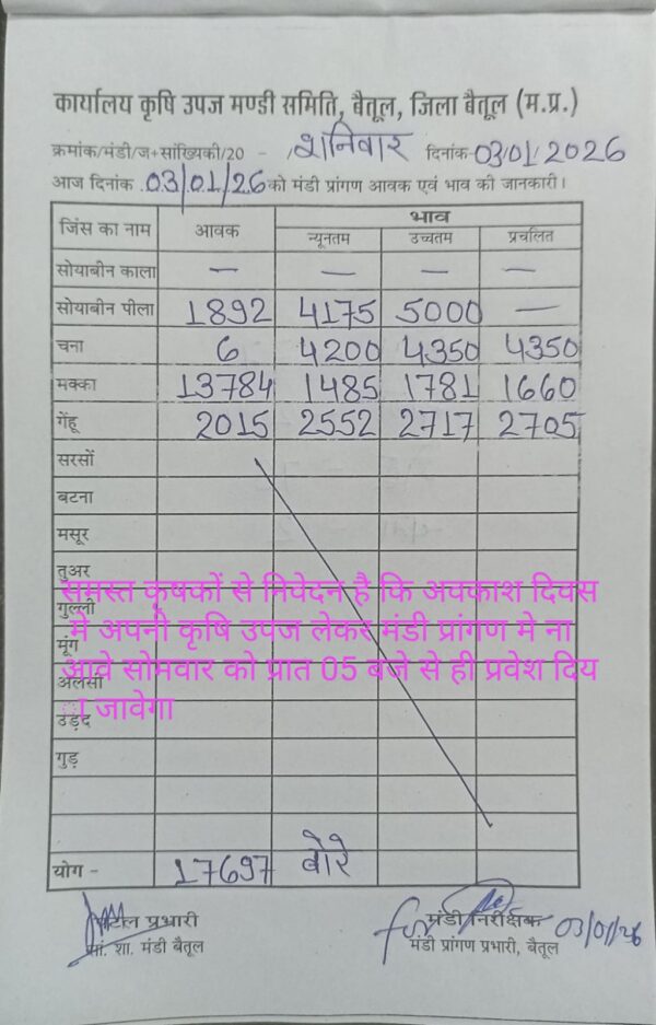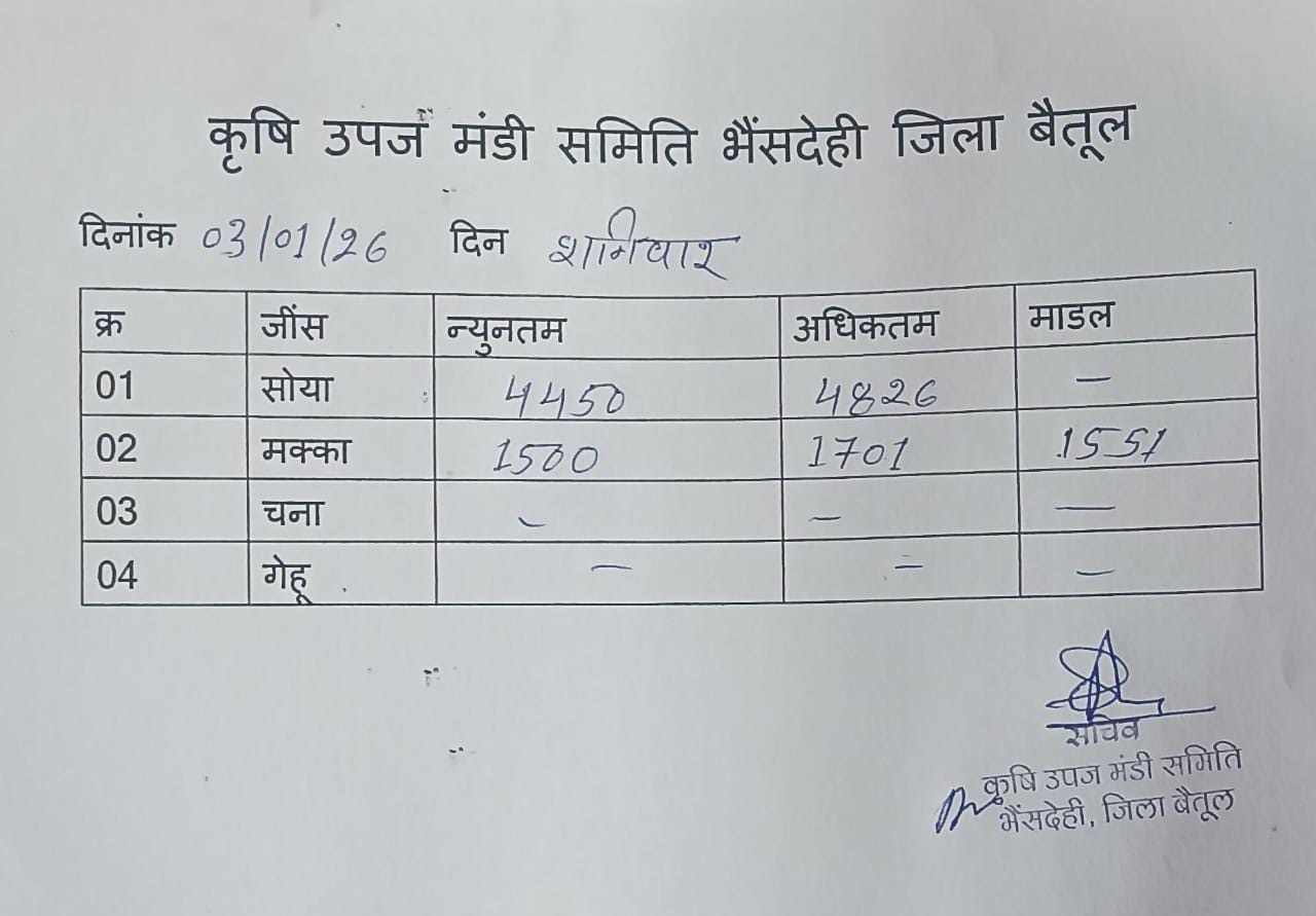 Betul Mandi Bhav 03 January 2026 : शनिवार को बैतूल मंडी में खरीदी हुई। उपज के दामों में भी उतार चढ़ाव देखने को मिल रहा है। 03 जनवरी 2026 को बैतूल मंडी में कुल उपज की आवक 17 हजार 697 बोरे रही। 2015 बोरे आवक गेंहू की रही, सोयाबीन की आवक 1892 बोरे हुई। मक्का की आवक 13784 बोरे उपज की आवक रही।कृषि उपज मंडी में गेंहू, और मक्का सबसे ज्यादा आवक