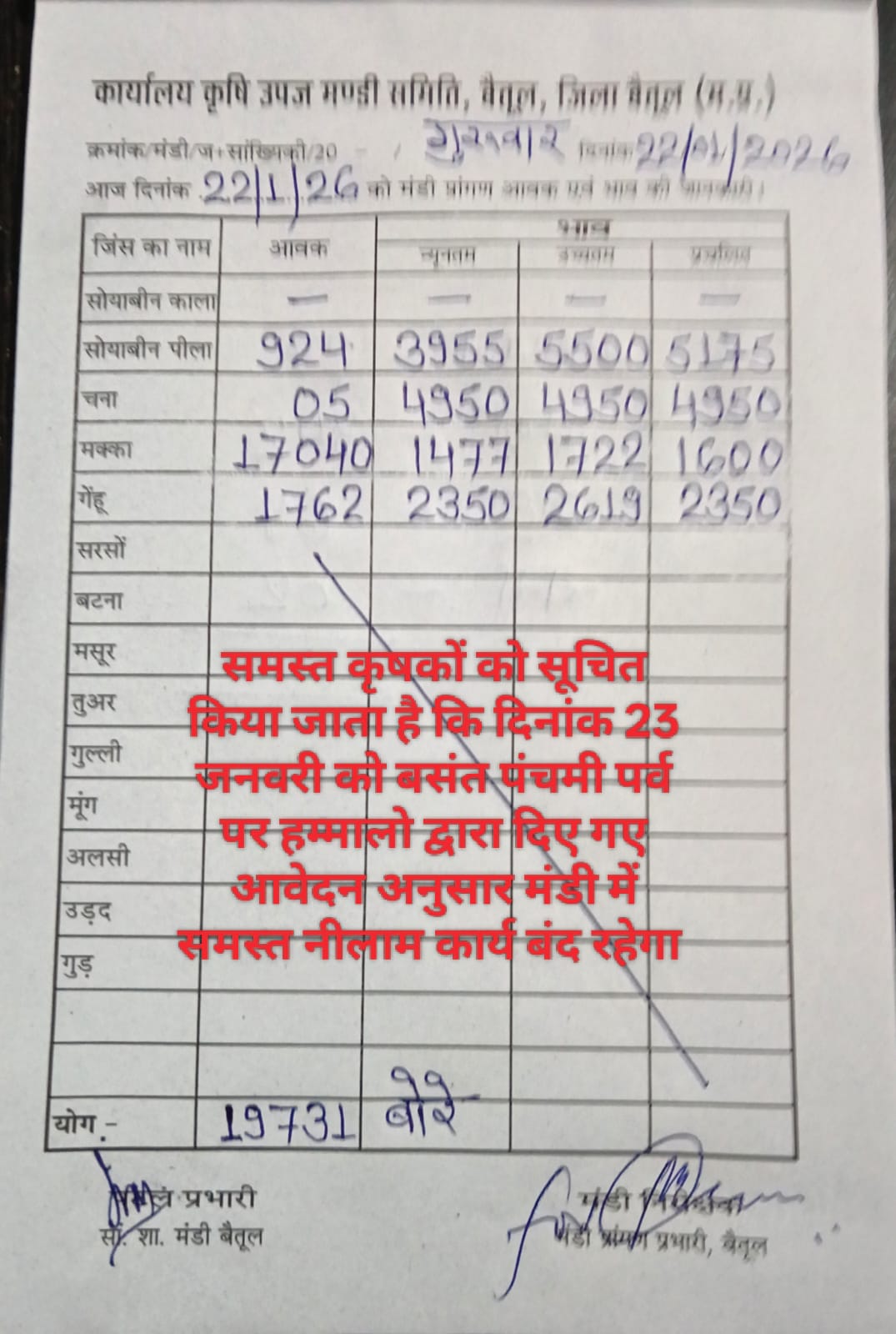 Betul Mandi Bhav 22 January 2026 : आज 22 जनवरी 2026 के बैतूल मंडी भाव, कल खरीदी रहेगी बंद