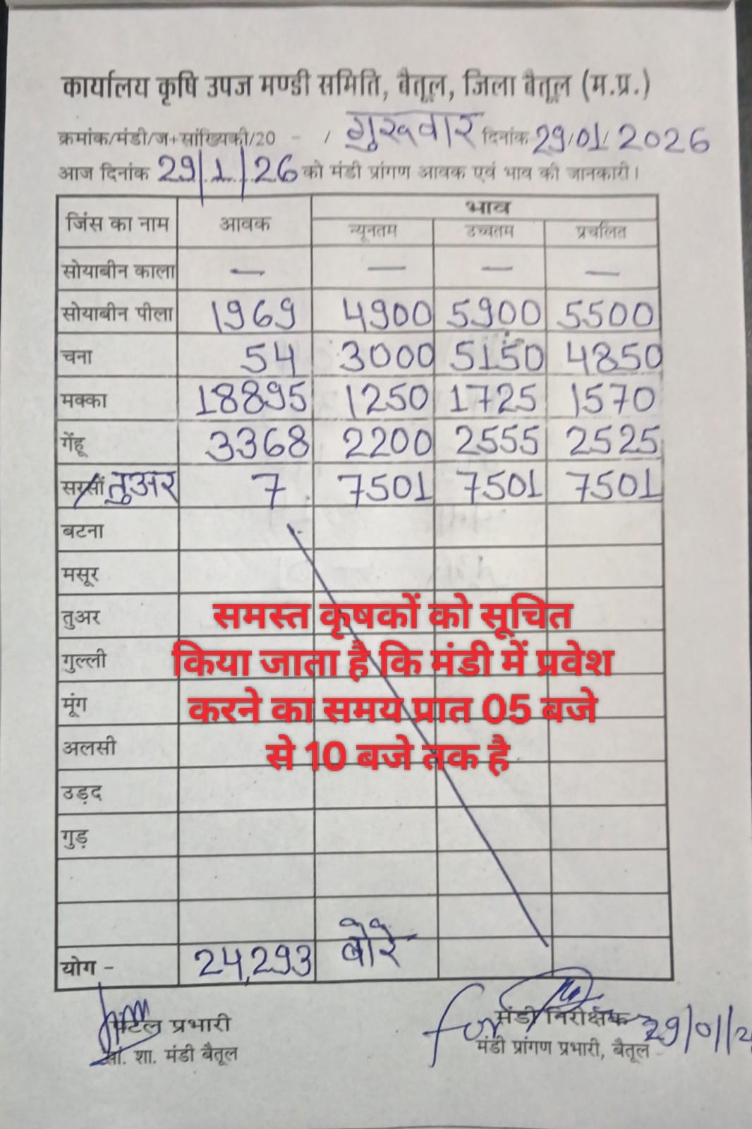 Betul Mandi Bhav 29 January  2026 : गुरुवार को बैतूल मंडी में खरीदी हुई।  उपज के दामों में भी उतार चढ़ाव देखने को मिल रहा है। 29 जनवरी 2026  को बैतूल मंडी में कुल उपज की आवक 24 हजार 293 बोरे रही।  सोयाबीन की आवक 1969 बोरे हुई।  मक्का की आवक 18895 बोरे उपज की आवक रही।