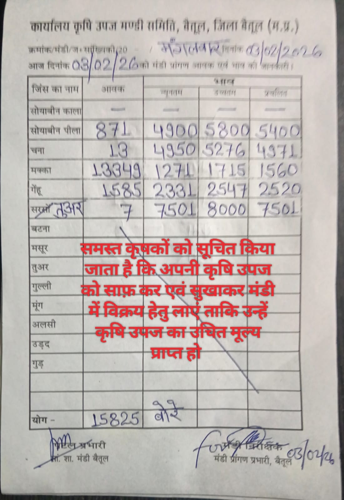 Betul Mandi Bhav 03 February 2026 : मंगलवार को बैतूल मंडी में खरीदी हुई। उपज के दामों में भी उतार चढ़ाव देखने को मिल रहा है। 02 फरवरी 2026 को बैतूल मंडी में कुल उपज की आवक 15 हजार 825 बोरे रही। सोयाबीन की आवक 871 बोरे हुई। मक्का की आवक 13349 बोरे उपज की आवक रही।कृषि उपज मंडी में गेंहू, और मक्का सबसे ज्यादा आवक