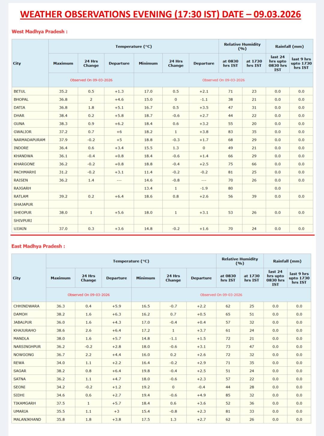 प्रदेश के सबसे ज्यादा तापमान वाले शहरों में रतलाम पहले स्थान पर रहा, जहां अधिकतम तापमान 39.0 डिग्री सेल्सियस दर्ज किया गया। इसके बाद बड़वानी जिले के तालुन में 38.3 डिग्री, धार में 38.2 डिग्री, नर्मदापुरम में 38.1 डिग्री और मंदसौर में 38.0 डिग्री सेल्सियस तापमान रिकॉर्ड किया गया। इधर बैतूल में भी तापमान 35 डिग्री पर पहुँच गया है।