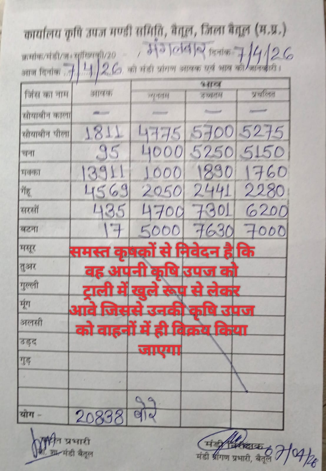 Betul Mandi Bhav 07 April 2026 : आज 07 अप्रैल 2026 के बैतूल, भैसदेही मंडी भाव, 20 हजार बोरे रही उपज की आवक