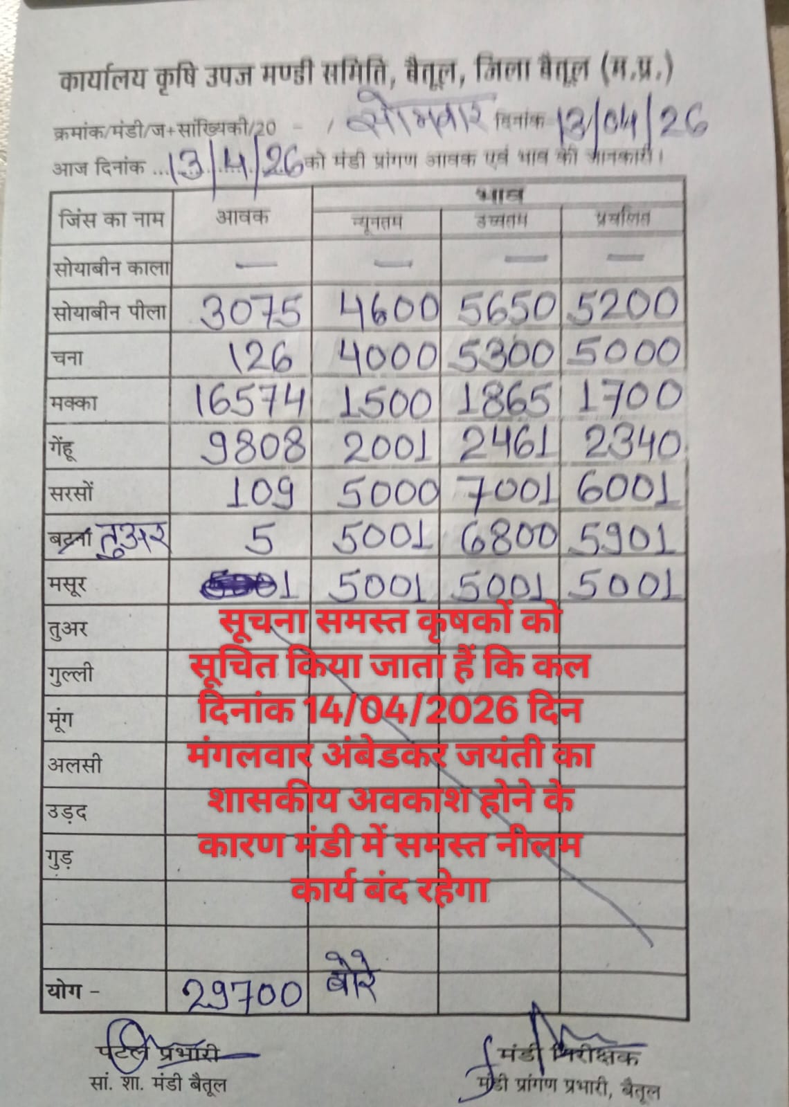 Betul Mandi Bhav 13 April 2026 : सोमवार को बैतूल मंडी में खरीदी हुई।  उपज के दामों में भी उतार चढ़ाव देखने को मिल रहा है। 13 अप्रैल 2026  को बैतूल मंडी में कुल उपज की आवक 29 हजार 700 बोरे रही।  सोयाबीन की आवक 2253 बोरे हुई।  मक्का की आवक 15566 बोरे रही।
