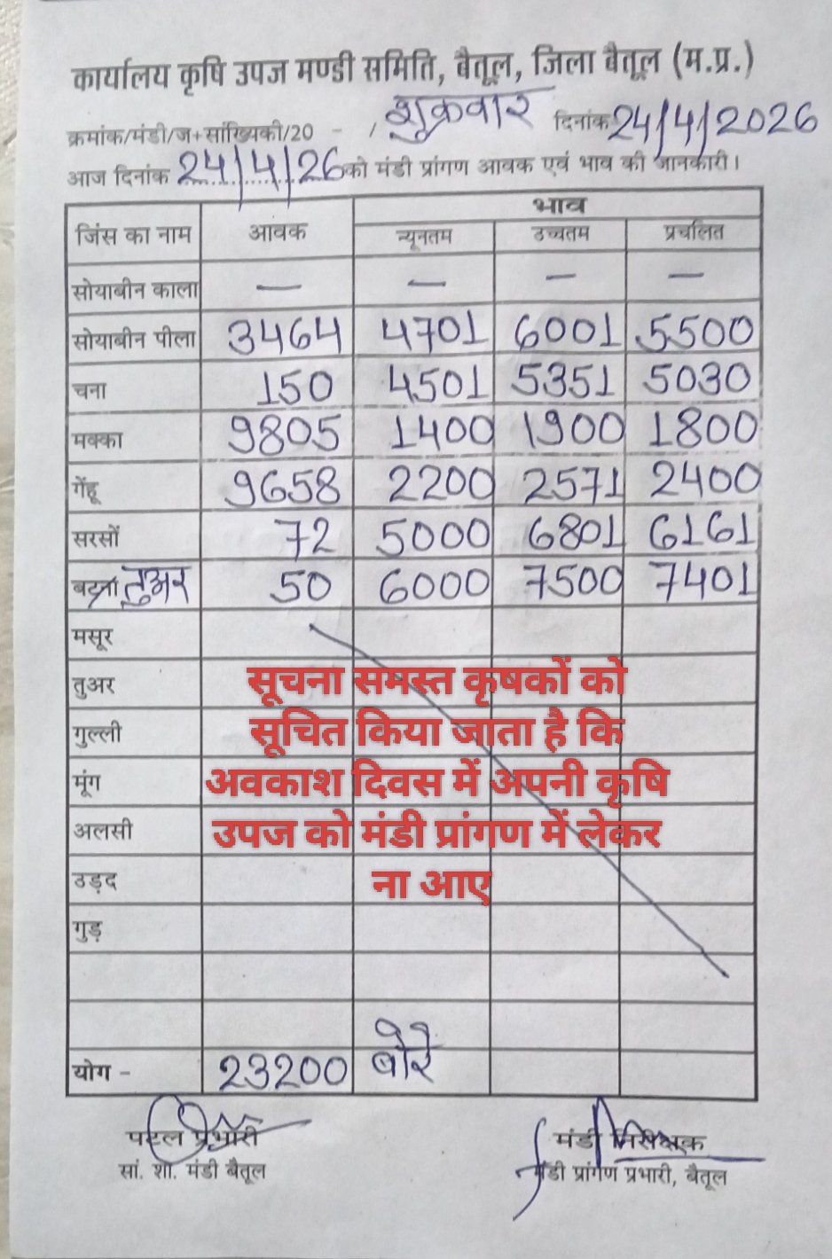 Betul Mandi Bhav 24 April 2026: Betul Mandi Bhav today 24 April 2026, arrival of produce was 23 thousand bags