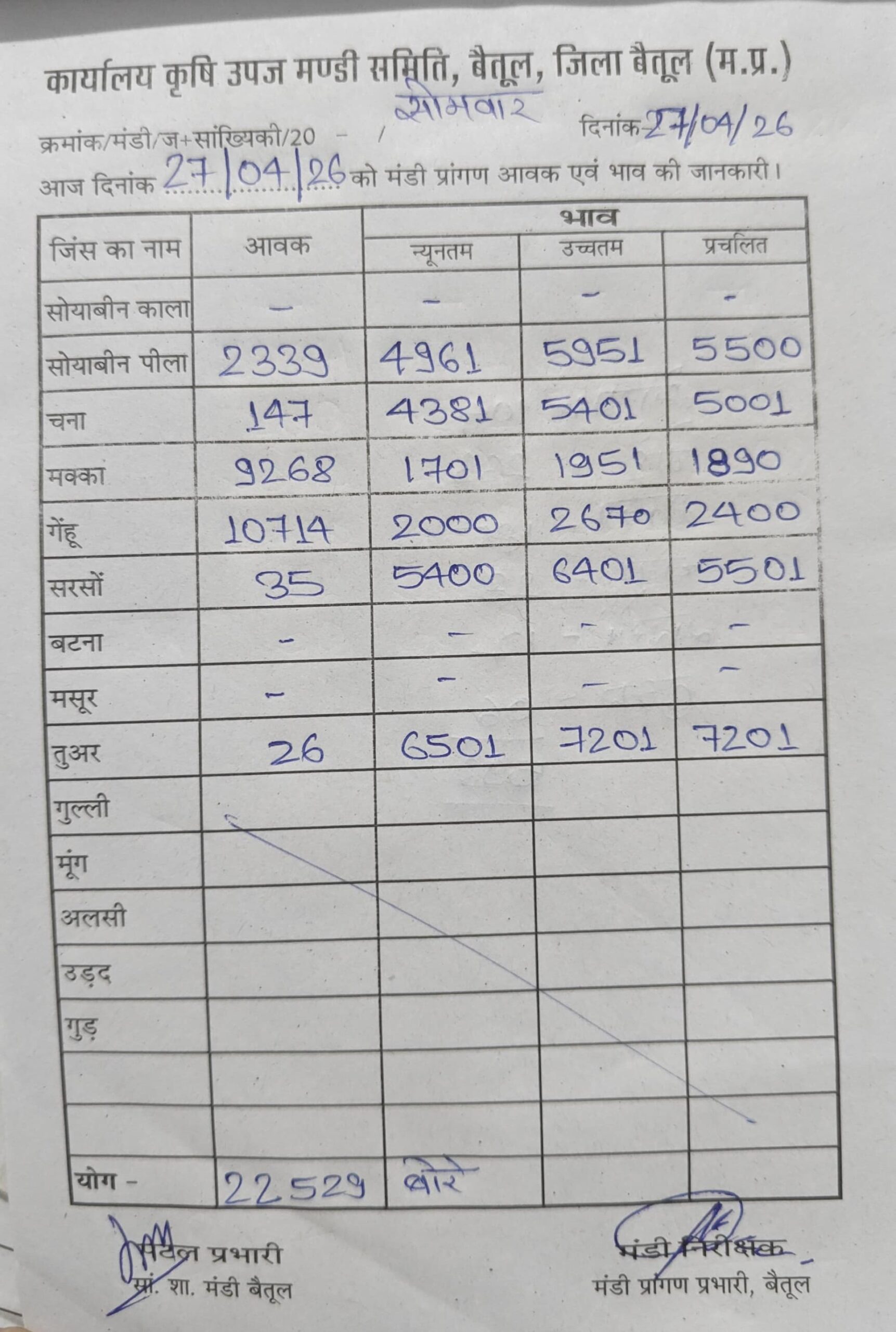 Betul Mandi Bhav 27 April 2026 : सोमवार को बैतूल मंडी में खरीदी हुई।  उपज के दामों में भी उतार चढ़ाव देखने को मिल रहा है। 27 अप्रैल 2026  को बैतूल मंडी में कुल उपज की आवक 22 हजार 529 बोरे रही।  सोयाबीन की आवक 2339 बोरे हुई।