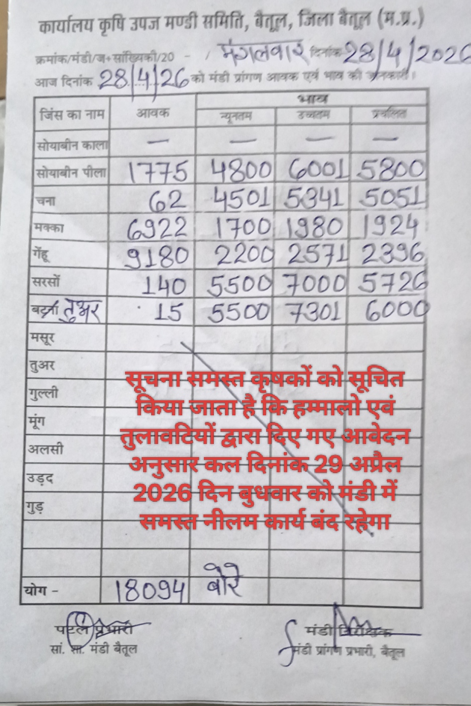 Betul Mandi Bhav 28 April 2026 : आज 28 अप्रैल 2026 के बैतूल मंडी भाव, कल खरीदी रहेगी बंद