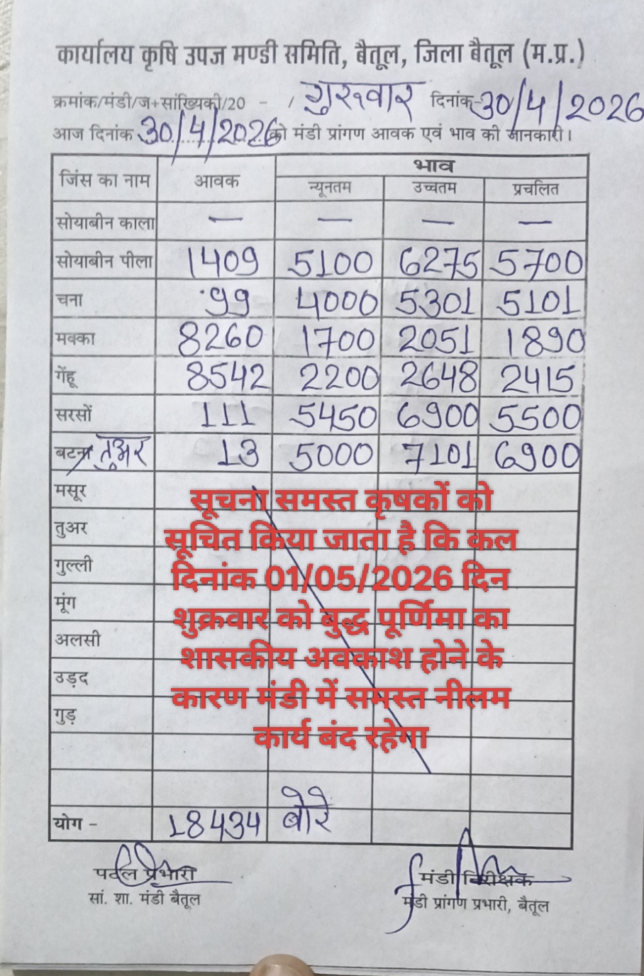 Betul Mandi Bhav 30 April 2026 : आज 30 अप्रैल के बैतूल मंडी भाव, 01 मई को बंद रहेगी खरीदी